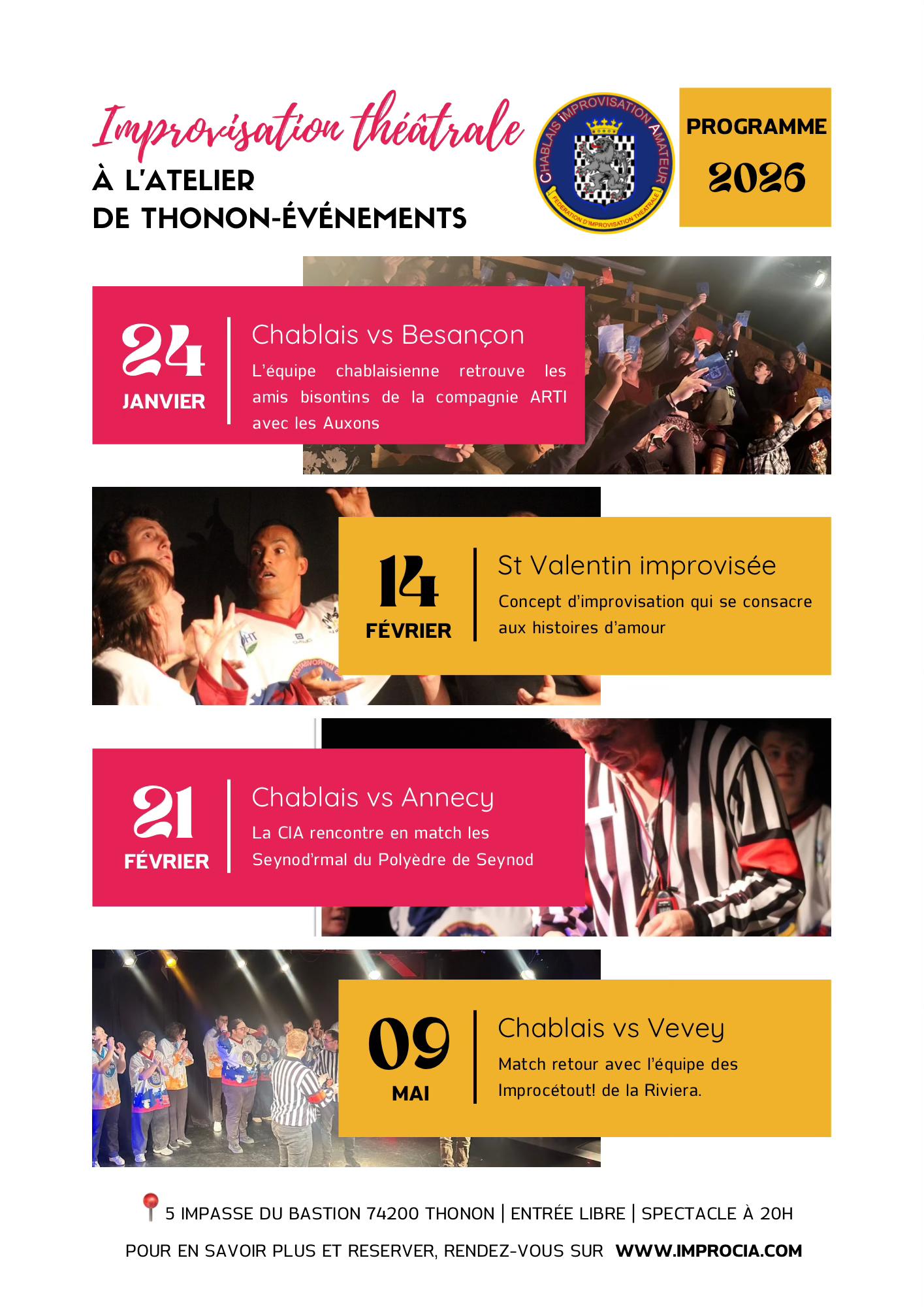Les Improcetout seront à Thonon pour un match retour plein d’énergie, d’improvisation et de surprises face à l’équipe locale de la CIA. Une soirée de théâtre spontané à ne pas manquer, entre rires, défis et belle ambiance.